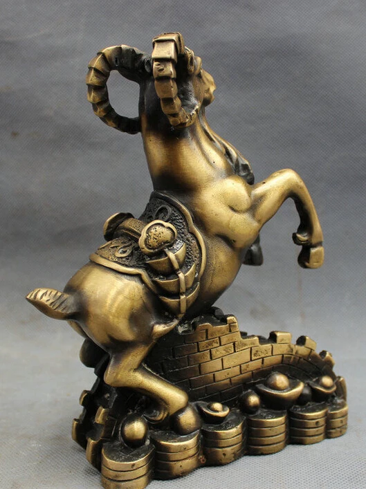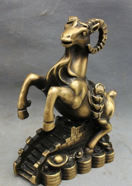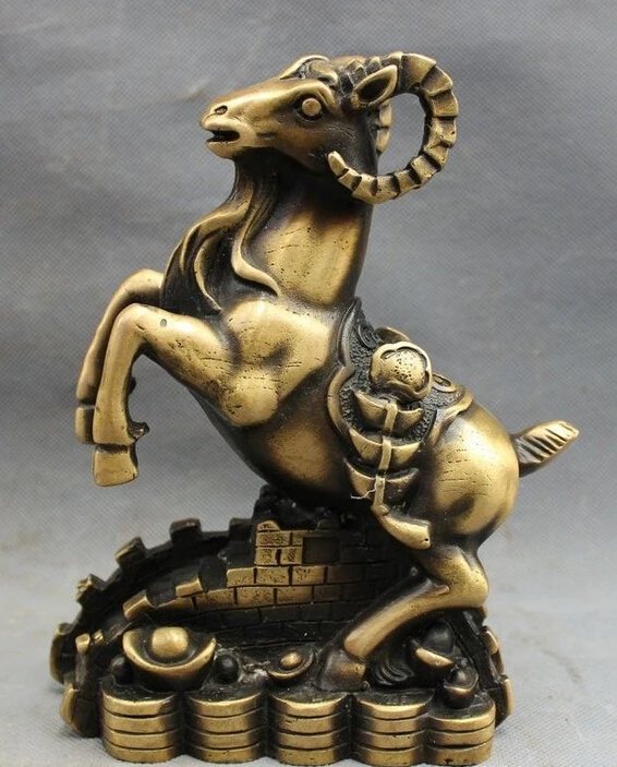 HIGH QUALITY 8" Folk Chinese Bronze Wealth Up Sheep Goat On Great Wall YuanBao Coin Statue